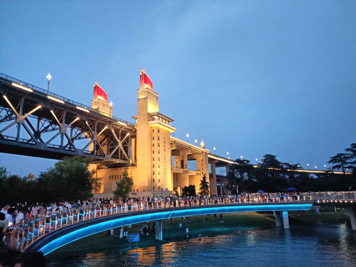 我们现在处在南京长江大桥的南岸,这里应该是新建了一段玻璃栈道。走在玻璃栈道上,能够更近距离的欣赏大桥。而且在栈道上向脚下看,栈道下的滔滔长江水肉眼可见,竟还有点小刺激。据说这里晚上灯光亮起的时候特别的漂亮,但今天我们没办法待到晚上亮灯了,还是有点遗憾。所以,我只能盗个图了。